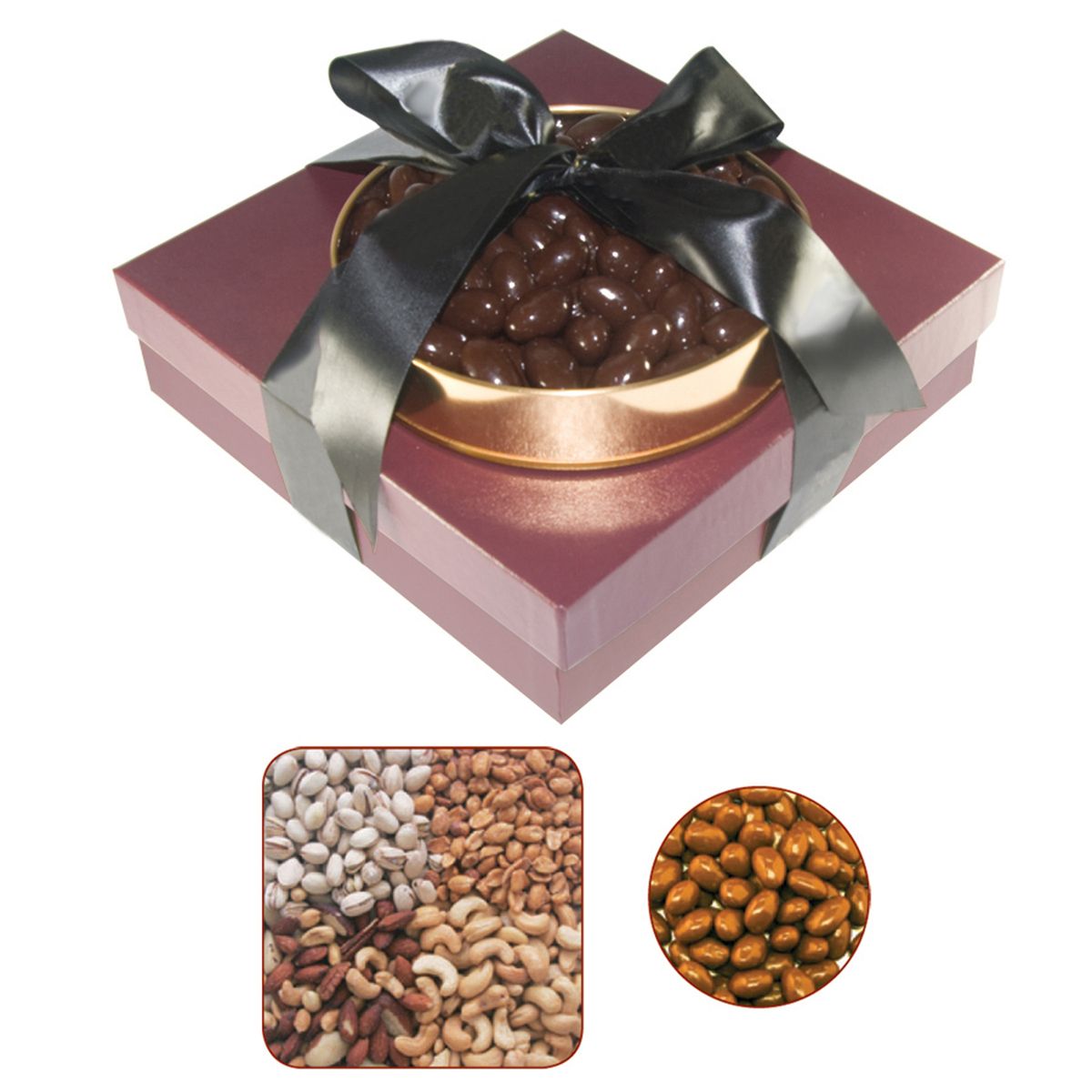 - Tower Of Gourmet Delights Features A Chairman Gift Box And Gold Rush Tray Filled With Pistachios, Honey Peanuts, Mixed Nuts, Cashews And Chocolate Covered Almonds.