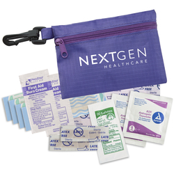 3 1/2" x 5" pouch constructed of 210D polyester ripstop material with clip. Includes 4 latex-free bandages, 2 snip bandages, 2 antiseptic towelettes, a hand sanitizer packet and a 2" x 3" adhesive pad.